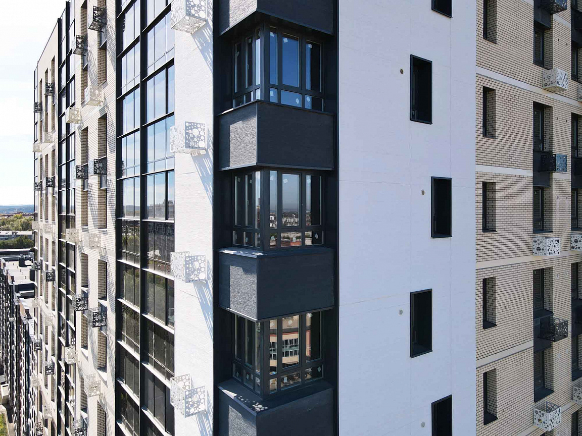 Большие окна серого цвета, угловое и панорамное остекление лоджий делают архитектуру разнообразной и создают хорошую инсоляцию квартиры.