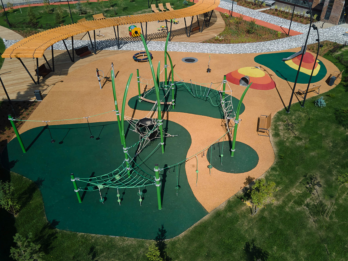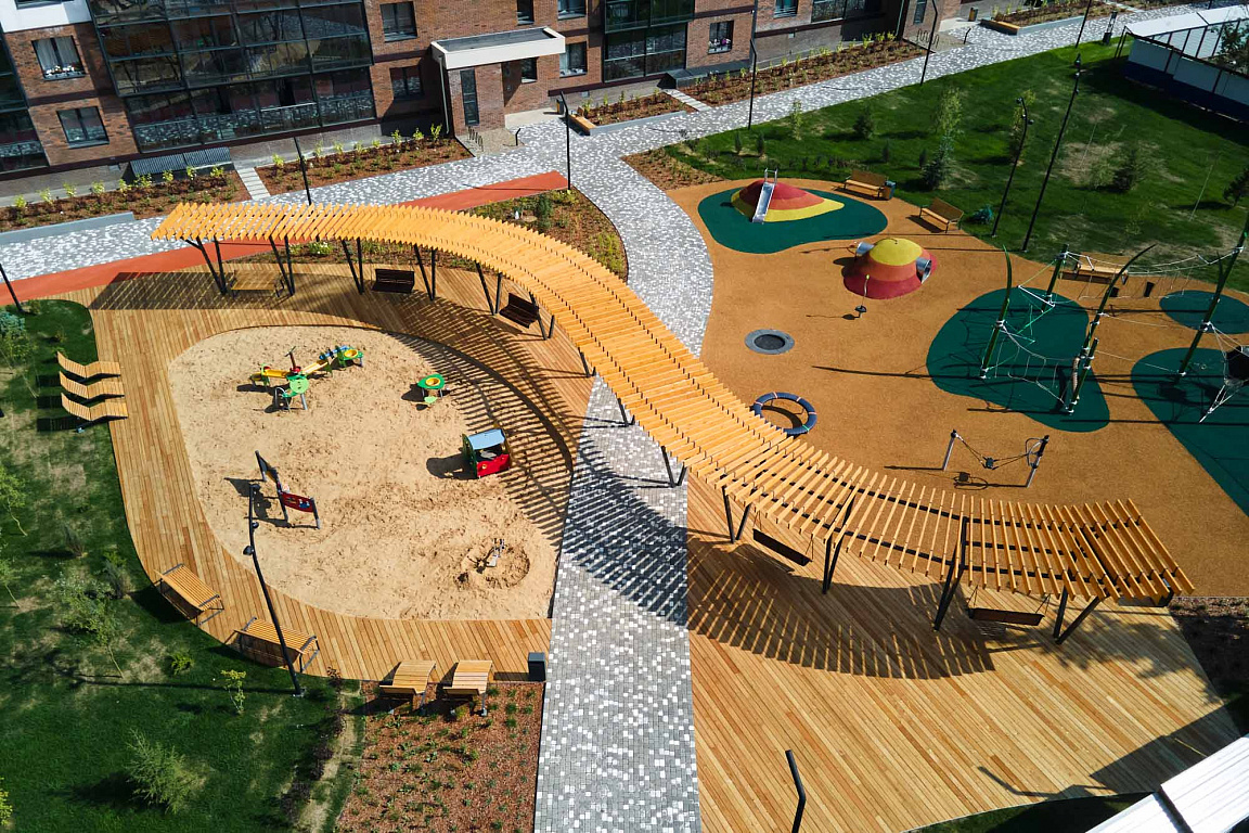 Для маленьких жителей предусмотрены детские игровые комплексы и площадки, большая песочница, батуты и скалодром для разных возрастов.