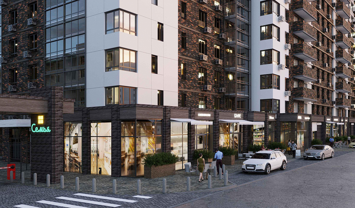 Стрит-ритейл расположен на первой линии, что обеспечивает высокий пешеходный и автомобильный трафик.